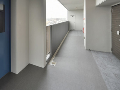 共用廊下とバルコニーの床には、安全性に配慮し、ノンスリップシートを採用。雨で濡れても滑りにくく安心。靴音を低減させる効果もあります。