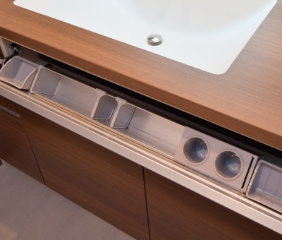 足元のデッドスペースを有効利用した、スライド式収納を採用しました。勢いよく閉めても減速して静かに閉まる高品位なソフトモーションレール付。