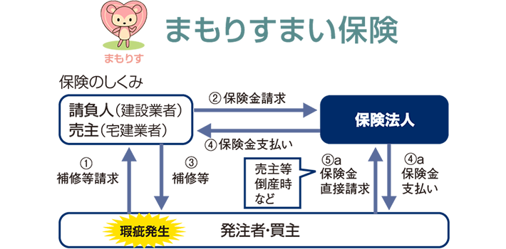 ⑤a/④a住宅事業者が倒産等の場合などの相当の期間を経過してもなお瑕疵担保責任を履行できない場合で、保険金をお支払いできる事由にあたる場合は、住宅取得者様は、住宅保証機構に直接保証金を請求し、保険金の支払を受けることができます。