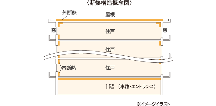 外壁はコンクリート厚約150mm以上とし、断熱材を吹き付け、プラスターボードとクロスを貼り断熱性と耐久性を高めました。戸境壁は180mm確保し、隣接する住戸間の防火性・遮音性を高めています。